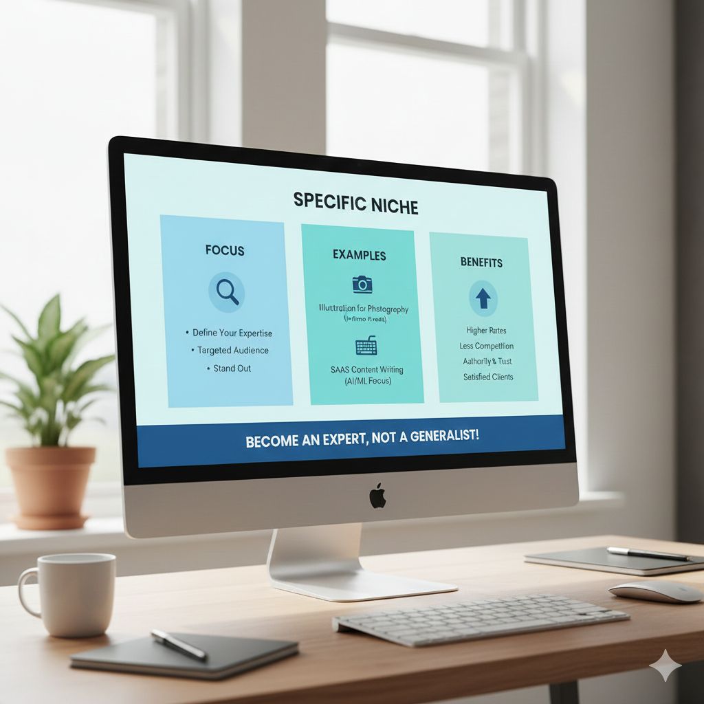 Sabse badi galti hoti hai ki beginners sochte hain ki sab kuch kar lenge. Jaise writing designing coding – sab try karte hain. Lekin yeh galat hai. Mai apna personal experience batata hu. Main shuru mein web development content writing aur social media management sab kar raha tha. Ek client ko website banaya lekin mera focus nahi tha to quality kharab hui. Example: Ek friend mera jo beginner tha ne photography aur video editing dono start kiye lekin kisi mein expert nahi ban paya. Solution? Ek niche choose karo jaise sirf content writing aur usme deep dive karo. Isse clients aasani se milte hain.